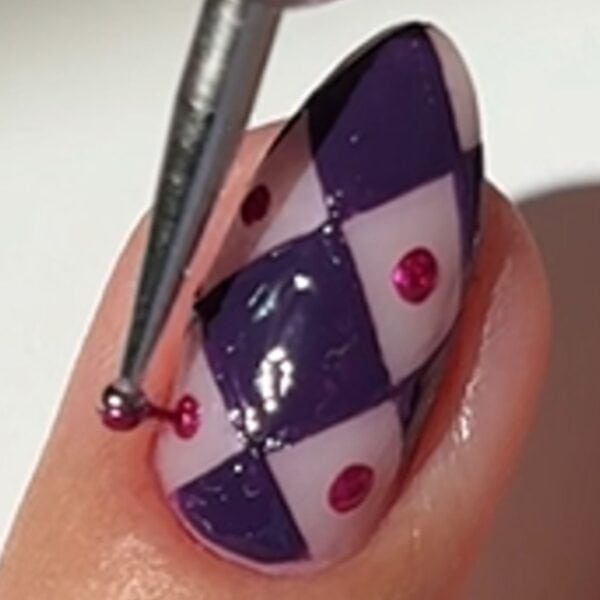 Once dry, use the dotting tool to add spots in the negative space diamonds using the bright pink metallic polish.