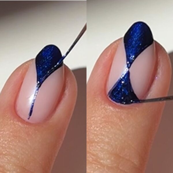 On the pinky fingers, use the dark blue shimmer polish and a thin nail brush to create two exaggerated curved triangles meeting in the middle of the nail.