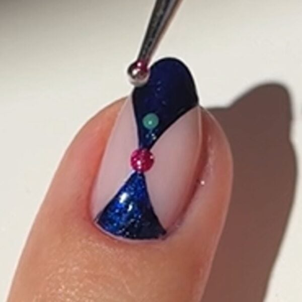 Once dry, use the dotting tool and bright pink metallic polish to add a dot where the two curved triangles meet, and two more dots above and below using the emerald green créme polish.