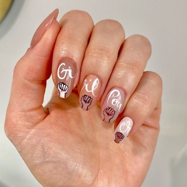Using a medium liner/striper brush dipped in a white gel polish, paint the letters 'Gi' on the index finger, 'rl' on the middle finger, 'Pow' on the ring finger and 'er' on the pinky. Cure. Apply top coat and cure to finish.