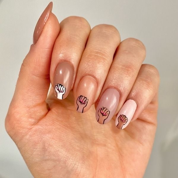Using a thin nail art brush, paint a fist shape on each nail with one of the gel polish colours used on the other nails. Cure.