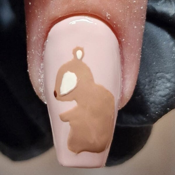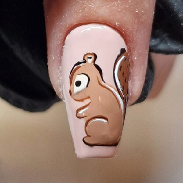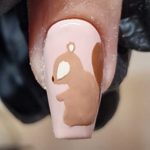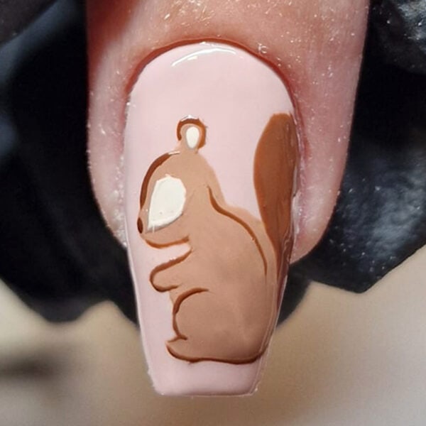 Using Brown Artisan Gel Paint and a liner brush, paint a bushy, curved tail at the back of the squirrel, spreading onto the next nail. Cure for 60 seconds.