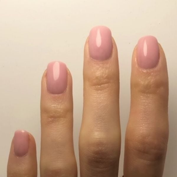 Apply Gellux in Rockin It to the thumb, index and pinkie fingers. Then, apply Gellux in Naturally Bronzed to the middle and ring fingers, being sure to leave a bare half-moon shape at the bottom of the nails, and then cure for 30 seconds.