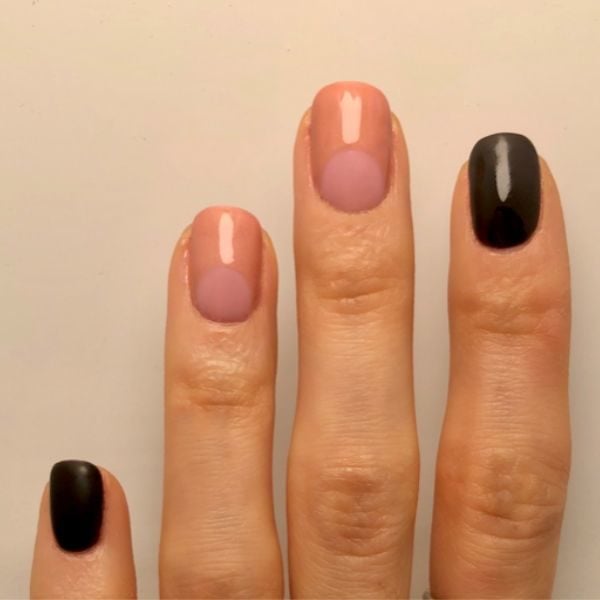 Apply Gellux Matte Top Coat to the bare half-moons, cure. Apply Gellux Mirror Glaze Top Coat to all fingers making sure to avoid the half-moon on the middle and ring fingers, then cure for 60 seconds. Finally, apply Gellux Shiny Top Coat and cure again. Wipe nails with Gellux Prep + Wipe and a slick of Gellux Nail & Cuticle Oil.