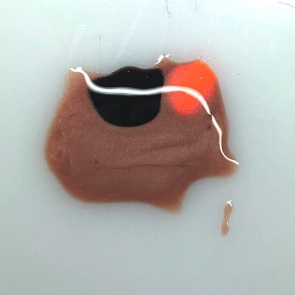 Next, mix some Gellux Easy Off Base Coat with the pale brown you made and paint a thin layer onto the middle and ring fingers (do not paint on the half-moon). Then, add small blobs of Gellux in Rockin It just slightly off the centre of the patches you had previously painted. Leave them to bloom for a few seconds, and then cure.