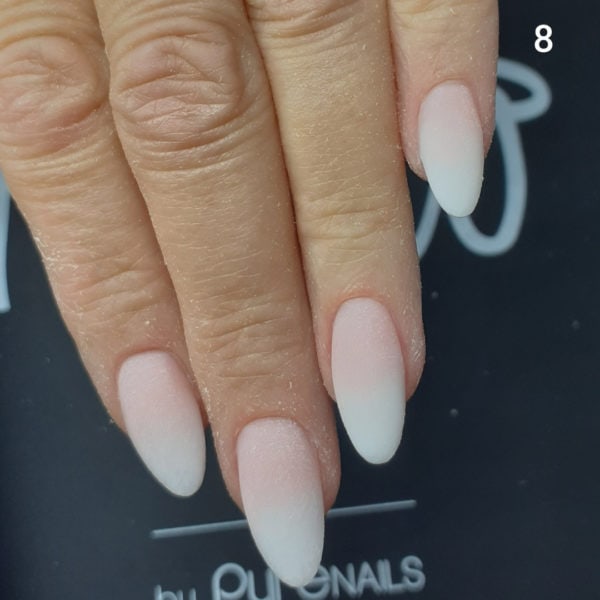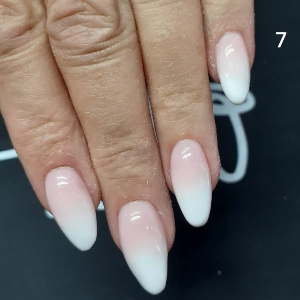 Apply PoliBuild in the shade Sheer Pink to the cuticle area of the nail, building your apex and blending down over the white to create an ombré effect. Cure for 60 seconds.