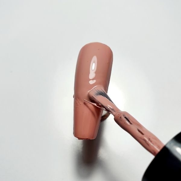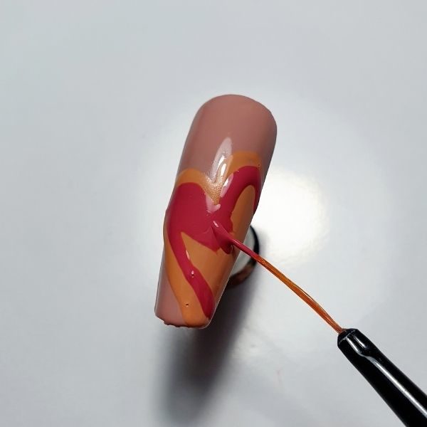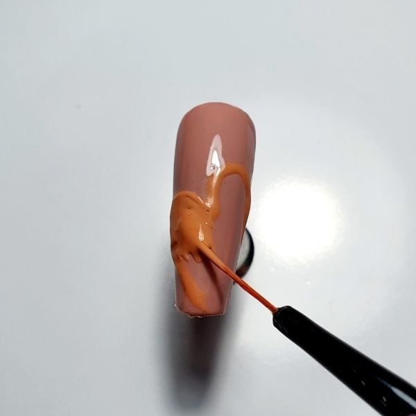 Paint a love heart shape at a slight angle across the nail, and fill it in. I used Halo Gel Polish shade, Pumpkin Spice. Cure.