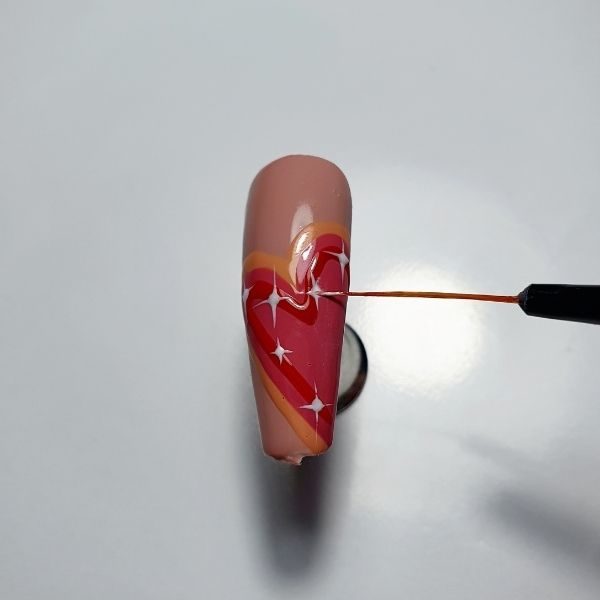 Using a dotting tool and Halo Gel Polish in French White, add small dots over the red outline of the heart. Once you're happy with their placement, use a thin nail art brush to pull out the gel from the centre of the dots, creating star effects. Cure.