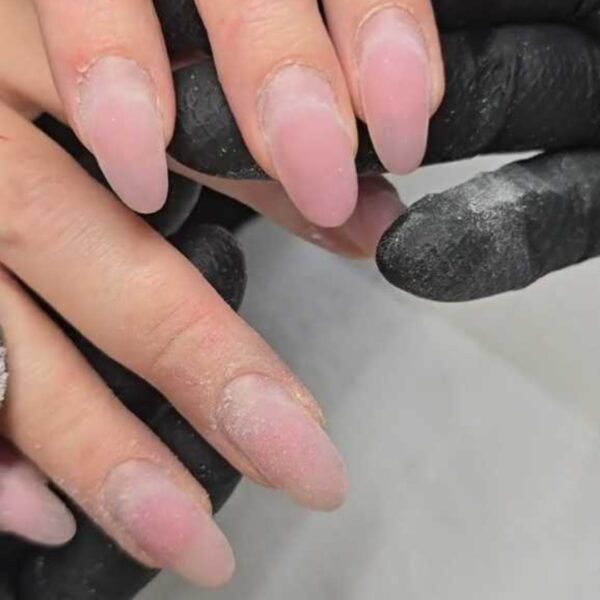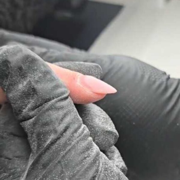 Using the KB E-file and Rebalancing and Under Nail Cleaner E-file Bit, start removing product from the underside at 20-25 RPM, to bring back the c-curve. Be mindful of the hyponychium, checking it regularly. If the client has a high hyponychium, you can pop a dot of coloured pen on this area, to ensure you are mindful.