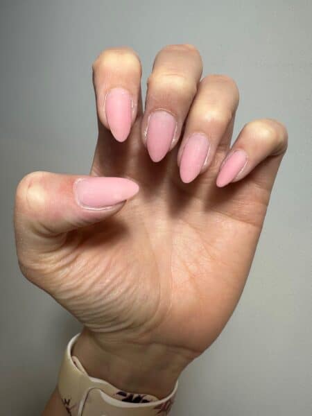 Prep the nails and push back the cuticles. Shape and buff the natural nails with a grey and yellow buffer. Dust and wipe the nails with Gellux Prep + Wipe then apply two thin coats of Gellux Builder Gel in Rose Pink, curing each layer for 60 seconds. Lightly buff the nails for a matte look, and use a nail brush to remove any dust.