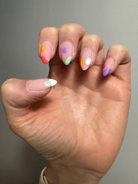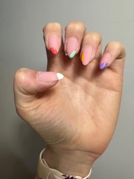 Using a thin liner art brush, create half a circle on each nail in a different place and colour. I applied Gellux Vividly Violet to the little finger, Gellux Mini Lemon Meringue to the ring finger, Gellux Jade's A Gem to the middle finger, Gellux Ocean Coral to the index finger and Gellux Purely White to the thumb. Cure each nail for 60 seconds.