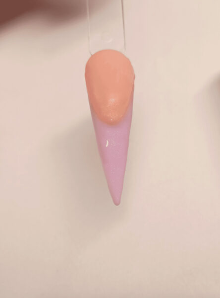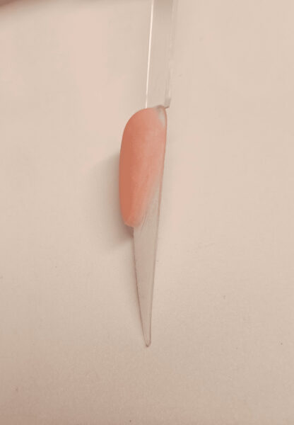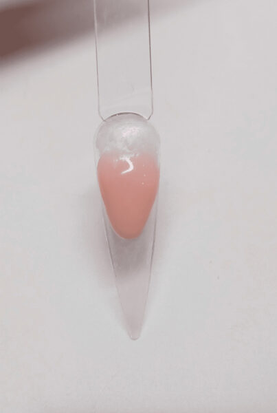 Add a bead of Cover Pink to the base of the nail, near the cuticle area, and blend into the first bead. Ensure it is flush against the cuticle area and the sidewalls are slightly thicker around the smile line.