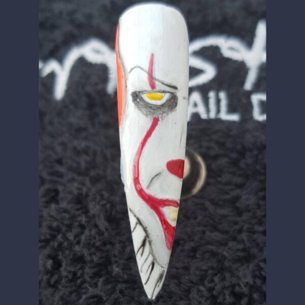 Session nail stylist, salon owner & educator, Marie-Louise Coster, shares how to create Pennywise the clown from Stephen King’s It on nails, using Artistic Nail Design. She used the following Artistic Colour Gloss shades: Bride, Swag, Hotzy, How Do Hue Do? and Wild, available in the UK via Sweet Squared.