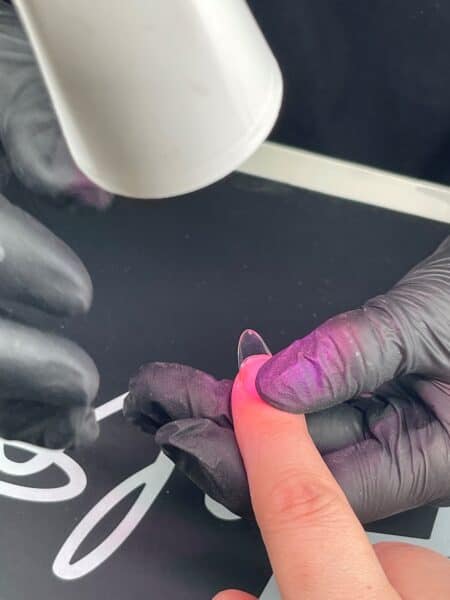 Flash cure each nail as you apply. When all tips are applied, cure all five nails for 30 seconds under the Halo Smart Dual Cure Lamp Pro.