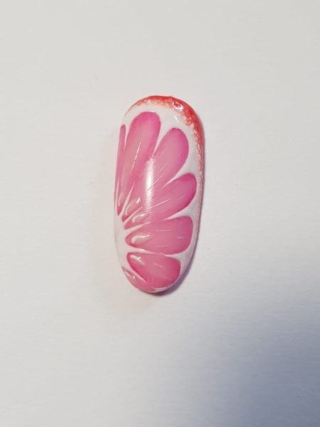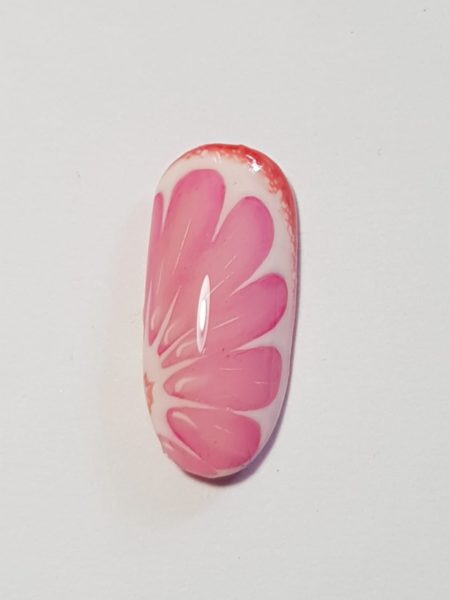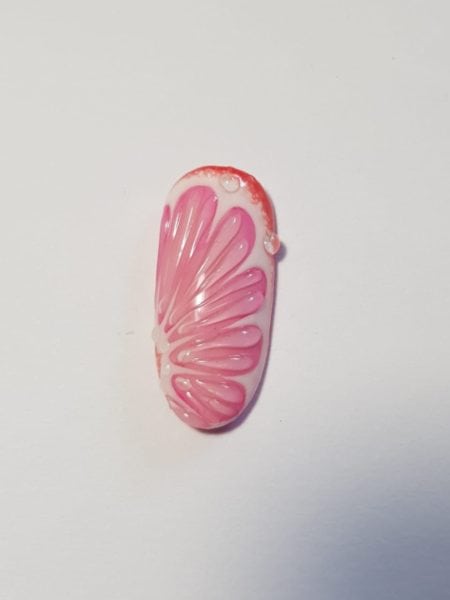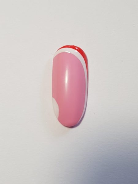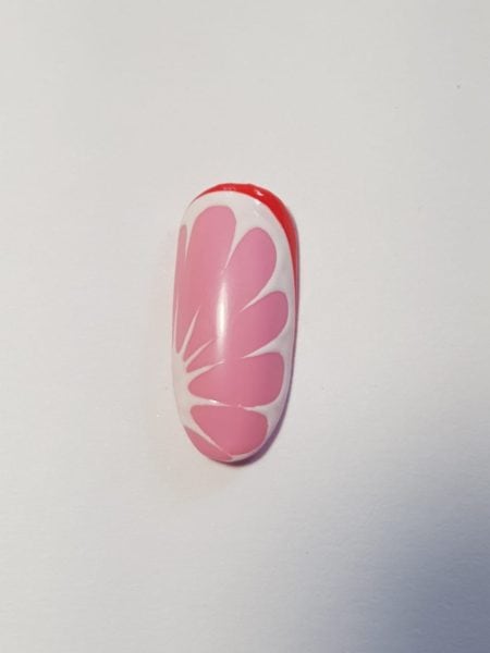 Use Perfect Match #07 to paint a curved line on top of the last line, extending farther up one side to near the tip of the nail. You are creating the skin and inner layer of the grapefruit peel. Add a small semi-circle to the side of the nail opposite where your line ends.