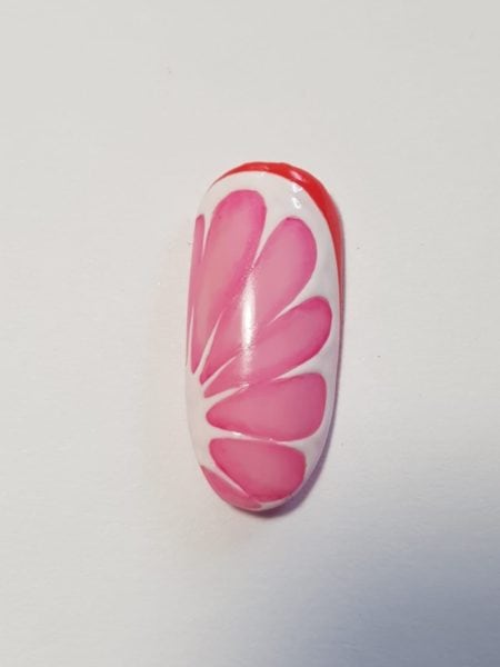 Using Perfect Match #07, lightly outline teardrop shapes reaching from the semi-circle all the way to the last line you painted, starting at one end of the semi-circle and moving towards the other. This is creating the detail on the inside of the fruit. Flash cure for five seconds.