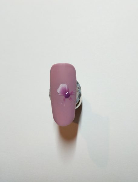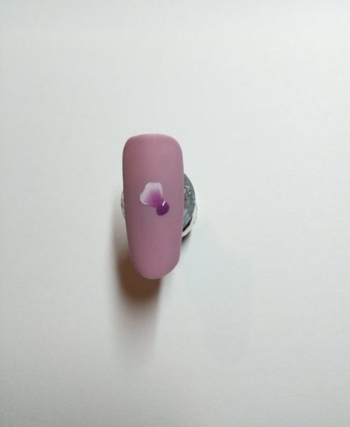 Mix Gelish Art Form Gel in Neon Pink and Neon Blue to create purple. Draw a middle of your flower and cure. Prepare your brush ready for your one stroke applications. Dip the toe of your brush into your White Gelish Art Form Gel and the heel of your brush into the purple. Stroke and blend on your palette. Mark with your brush borders of your petals, don't cure.