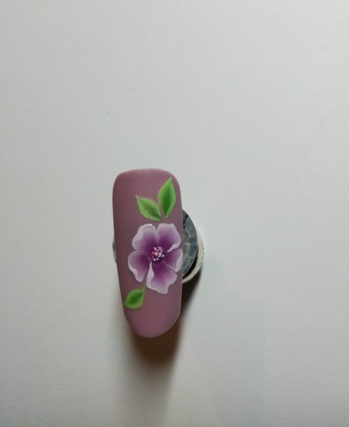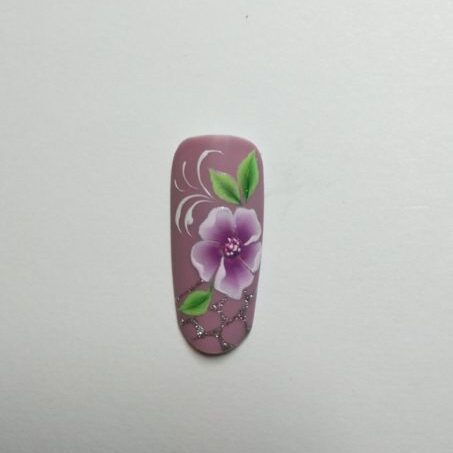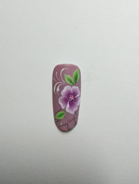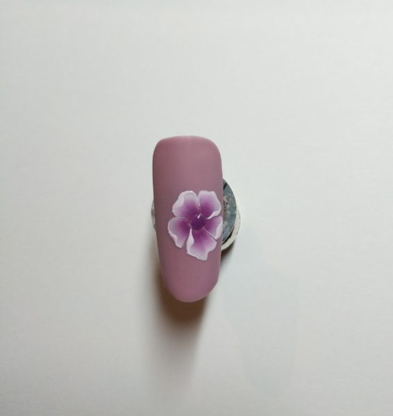 Monika Kupien, Nail Harmony UK educator, creates a pretty lilac one stroke design using Gelish Art Form Gel…