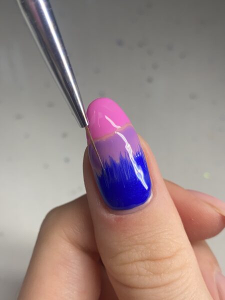 Using the The Manicure Company's Stripe Liner Nail Art Brush, blend the shade nearest the cuticle into the middle shade using upwards brushing motions.