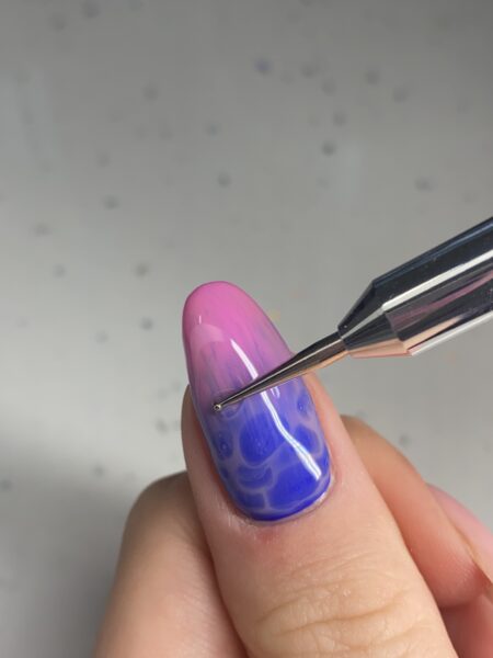 Using the Zero Gel Polish Base Coat and a dotting tool, place different sized dots of product in random areas over the uncured Parisian Pink shade. Once you are happy with the placement and design, cure for 60 seconds.