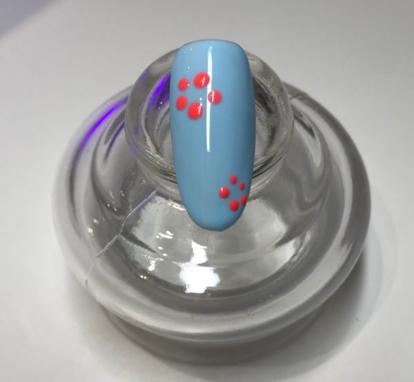 Once cured, place five dots in a circle using Gelish Rocking The Reef to contrast the blue tone. Use these dots to map out where your design will be. Do not cure these dots.