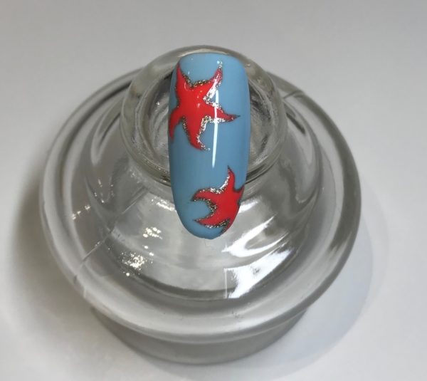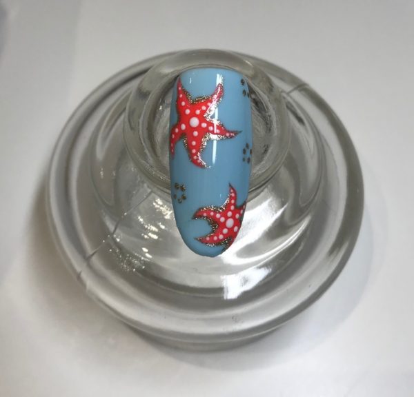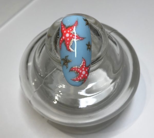 Using the same method for the large starfish, place dots to map out three other smaller starfish for detail and to create an odd number. Use Gelish Give Me Gold to tie in the small starfish with the detail on the larger ones. Do not cure.