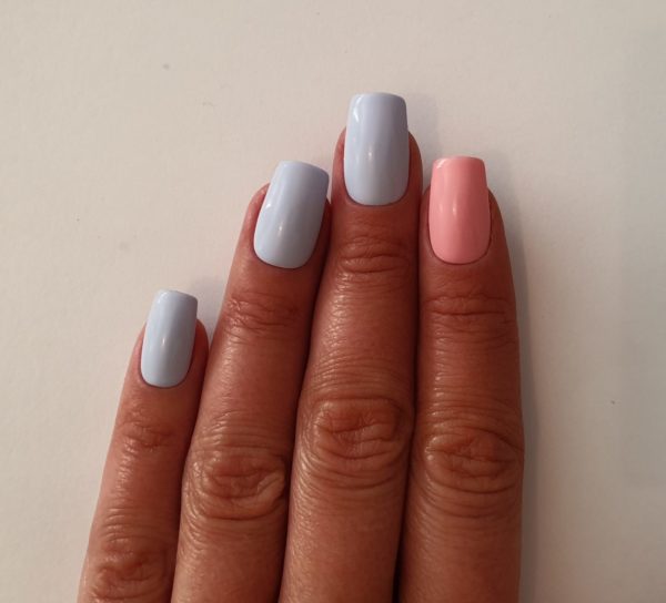 First start by prepping the nails by pushing back the cuticle, filing to shape and gently buffing the nail. Remove any excess dust and wipe with Gellux Prep + Wipe. Then, using Gellux Fast Bond, apply to the nails and let dry. Apply the Gellux Easy Off Base Coat and cure. Then, apply a thin coat of Gellux in She Sells Seychelles to the index finger and then apply Gellux in Stormy to the remaining nails and cure. Repeat this for the second coat but making sure to cap the edges.