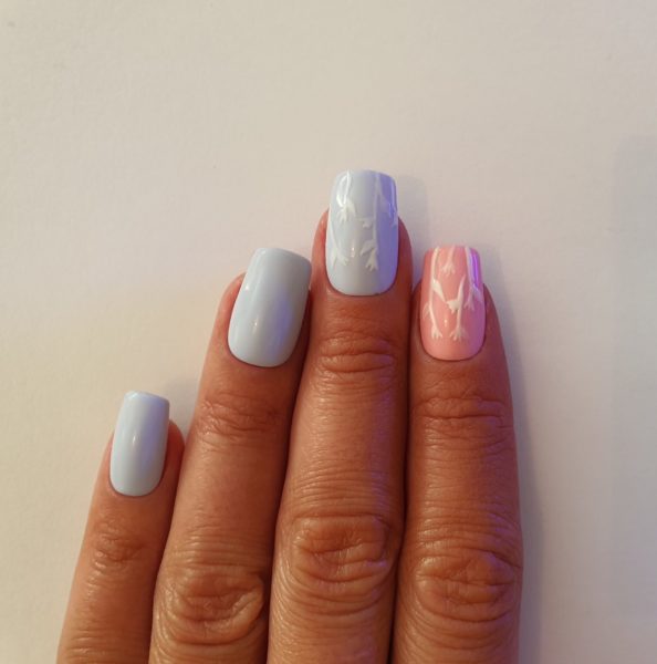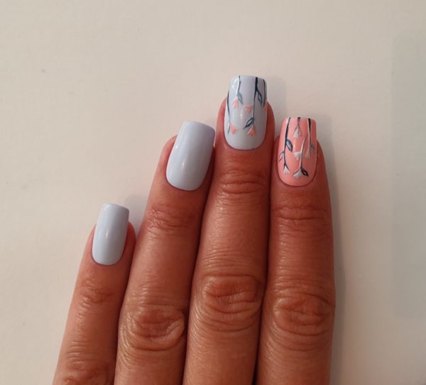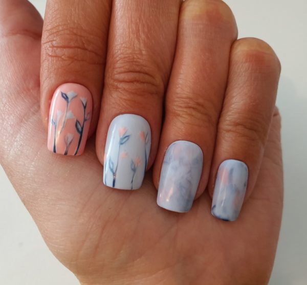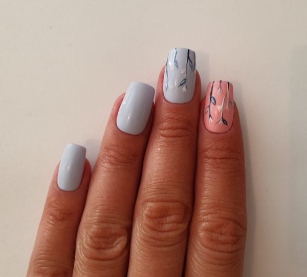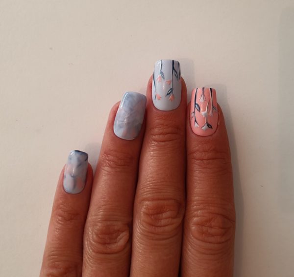 Then, using Gellux in She Sells Seychelles, create your flowers on the middle fingers and use Gellux in Stormy to colour your flowers on the index finger and cure.