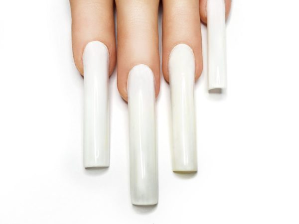 Prepare the nail and create enhancements in your chosen system with your preferred technique. Apply a white gel polish. Cure. Apply top coat with an inhibition layer. Don’t cure.