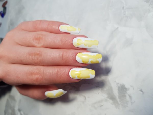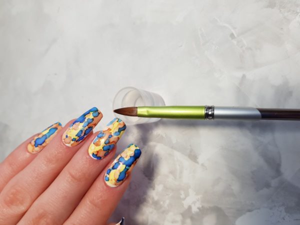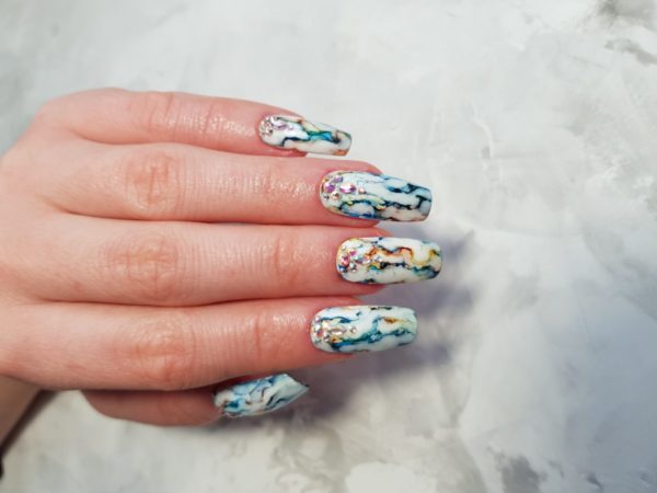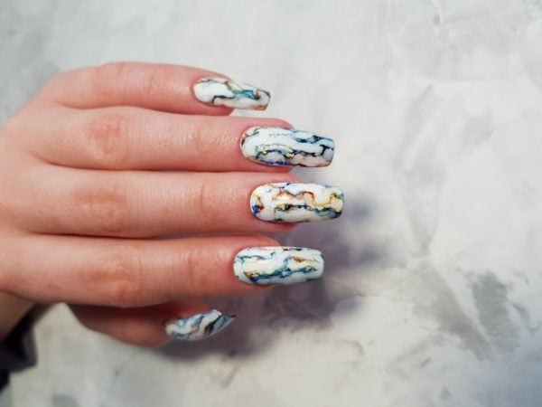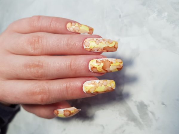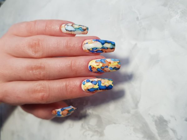“Alcohol inks are very popular at the moment!” reveals Anastasiia Morozova. “I love this style of nail art, I think it afford such an interesting effect. Don’t be surprise if your client will love the result even without blending the colours!”