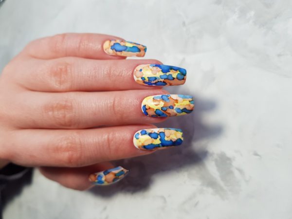 Add drops of blue ink overlapping the colours already on the nail. As the inks air dry, there’s no need to wait too long for applying the next colour.