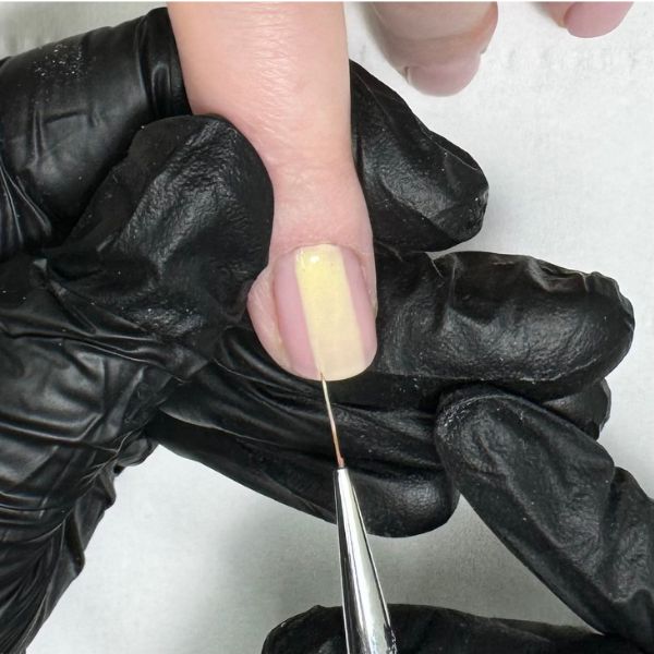 Using a liner brush, make sure the edges are crisp and straight. If the nail plate is narrow, you can use the liner brush to paint on the coloured band. Cure.