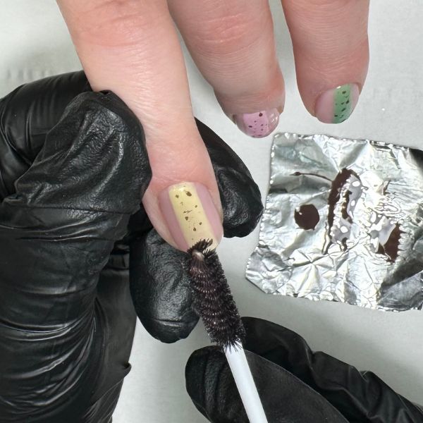 After curing, wipe over nails to remove the inhibition layer. Using GelColor in You Don't Know Jacques and a disposable mascara spoolie, apply speckles to the pastel band, and cure when happy.
