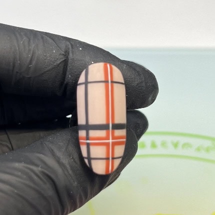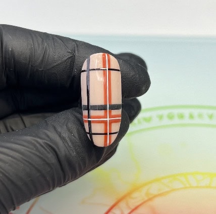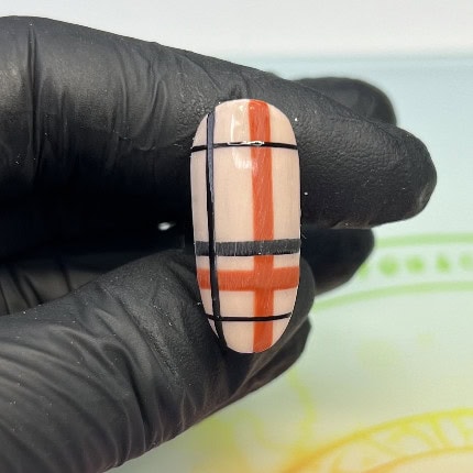 Paint a thick black line above the horizontal orange line using Black Artisan UV/LED Gel Paint, and cure. Then, paint the three finer black lines using the gel paint, as shown, curing after creating each one.