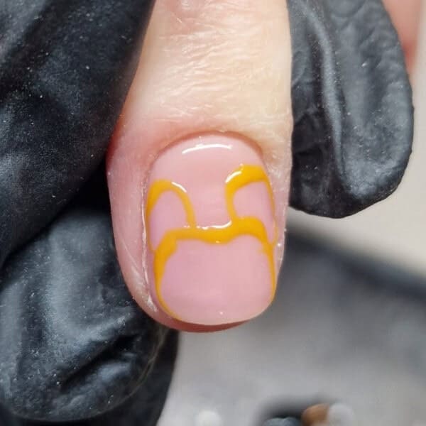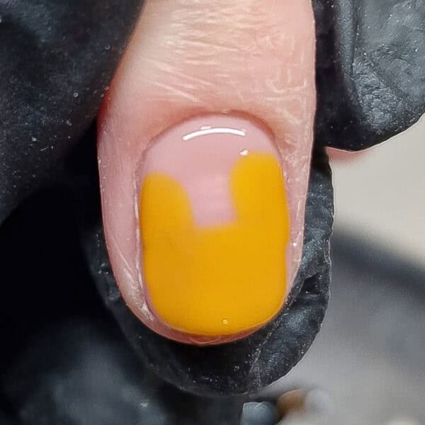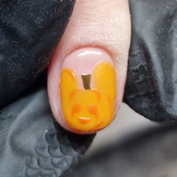 Paint a rough outline of the Mickey Mouse pumpkin, as shown. I used a custom mix of Nailchemy Artisan UV/LED Gel Paints in Yellow and Orange.