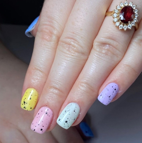 Create the base for Mini Egg styles with a pastel hue, and use a fine nail art brush or dotting tool with black or brown nail colour to hand-paint a speckled effect.