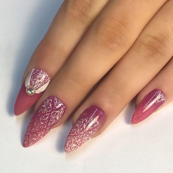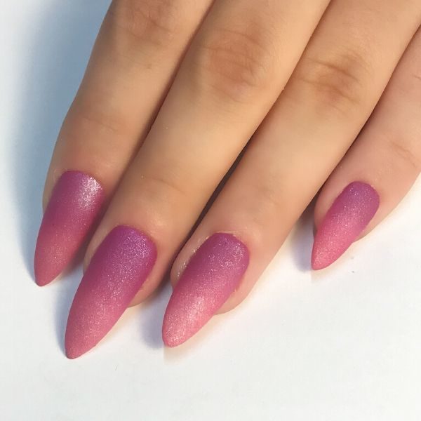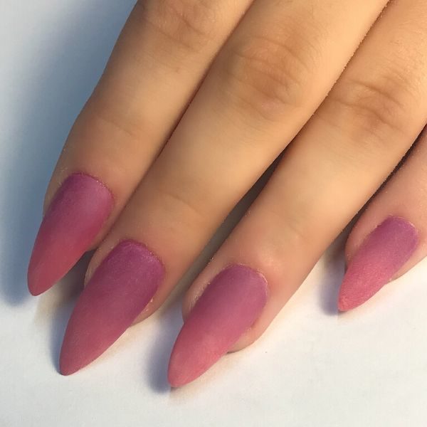 Sculpt an almond nail enhancements using coloured acrylic powders, creating an ombré design from dark to light (cuticle to tip).