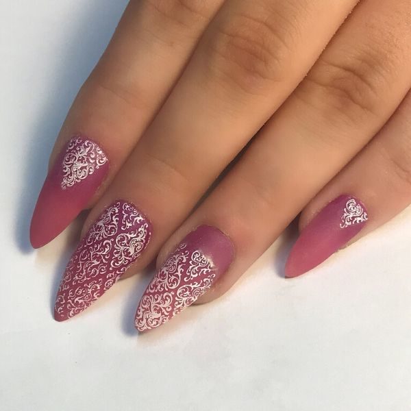 Make sure the nails are clean and dry before stamping. Use a vintage style stamping plate and white stamping polish to create your design.