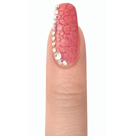 With Nail Surface Cleanse and Wipe It Off lint-free wipes, cleanse the inhibition layer of the nail. Finish your look by gluing rhinestones and massaging Nourish Cuticle Oil into the skin surrounding the nail plate.