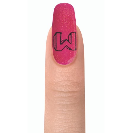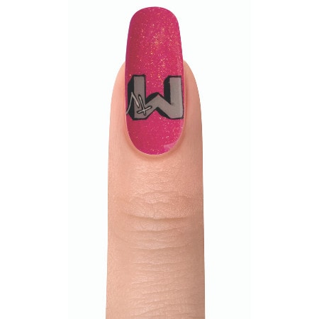 Using Art Form Gel in the shade Essential Black, paint “TV” inside the “M” and fill in the shaded areas. Cure for 30 seconds. Mix Art Form Gel in the shade Essential White and Essential Black to create a grey.