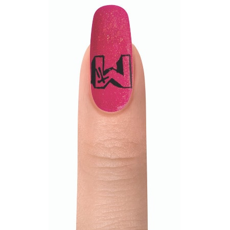 With the grey mixture, fill in the “M”. Finish the design by filling in the “TV” with Art Form Gel in the shade Essential White and cure for 30 seconds. Apply Top It Off to the entire nail, making sure