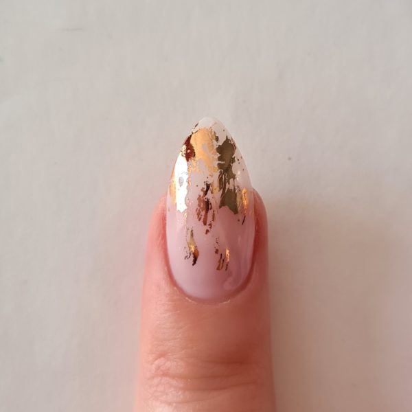 Complete CND™ P.R.E.P technique. Apply CND Shellac™ Base Coat and cure. Apply a layer of CND Shellac™ in Bouquet and cure. Randomly dab over the nail with a rose gold foil, focusing on the tip area and gradually bringing the foil half way down the nail.