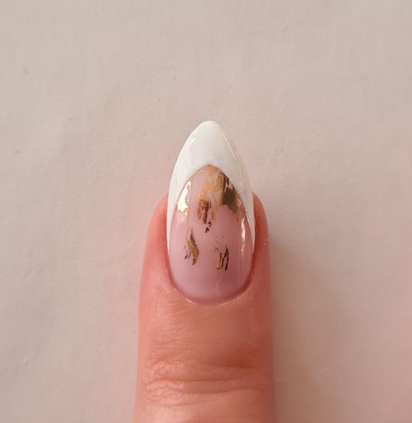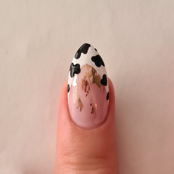 Jemma Ball, owner of Jemma Elizabeth Beauty, Staffordshire, created this cow print alternative French manicure, with a touch of gold foil. She used CNDTM products, which are available in the UK via www.sweetsquared.com. Check out her step-by-step below…