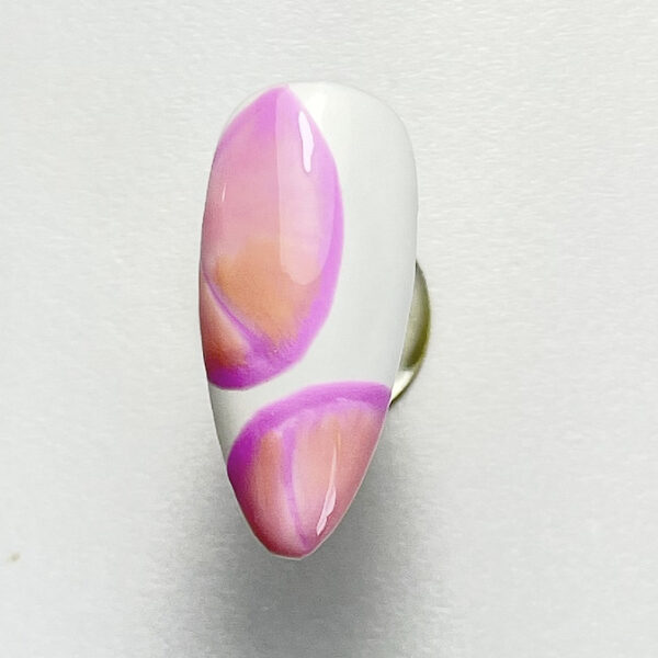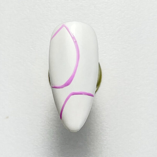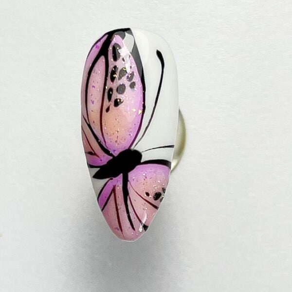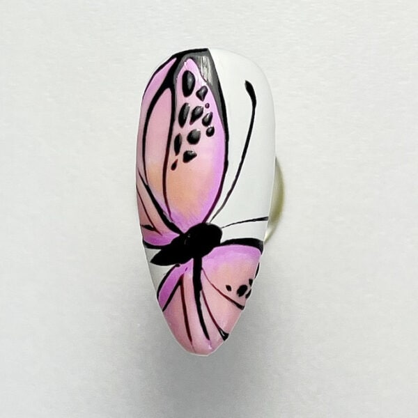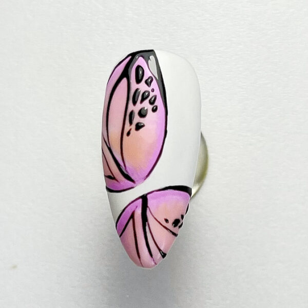 Paint the nail using a white gel polish for the base. Cure. Use a light pink gel polish to create soft, curved shapes resembling butterfly wings.