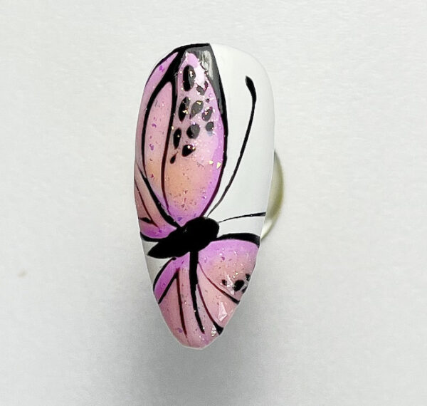 Use a thin detail brush with black gel polish to outline the wings and delicate wing structures. Use a dotting tool or thin brush to add small black dots to the top sections of the wings. Cure between each detail.