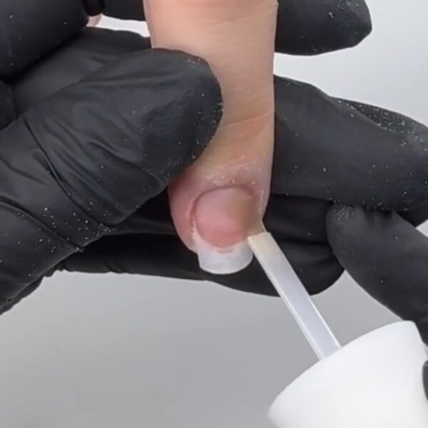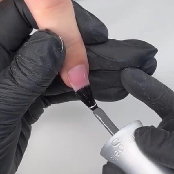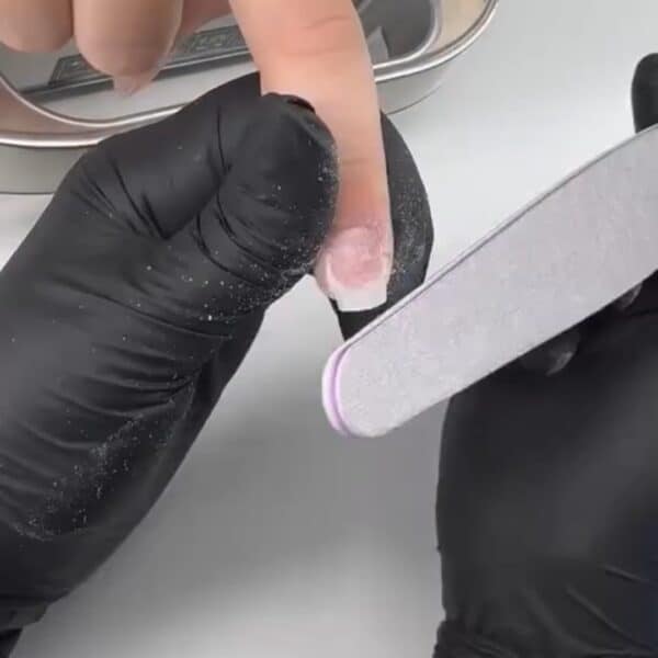 Blend the seam of the tip using a 180/180-grit file so it sits flush with the natural nail, ensuring a smooth transition and natural appearance. Remove dust using a nail dust brush or lint-free wipe.