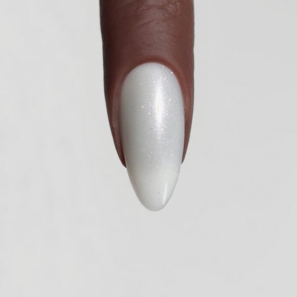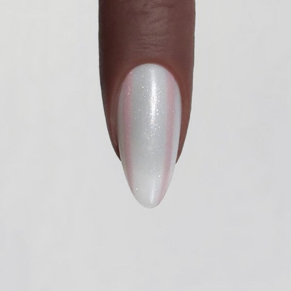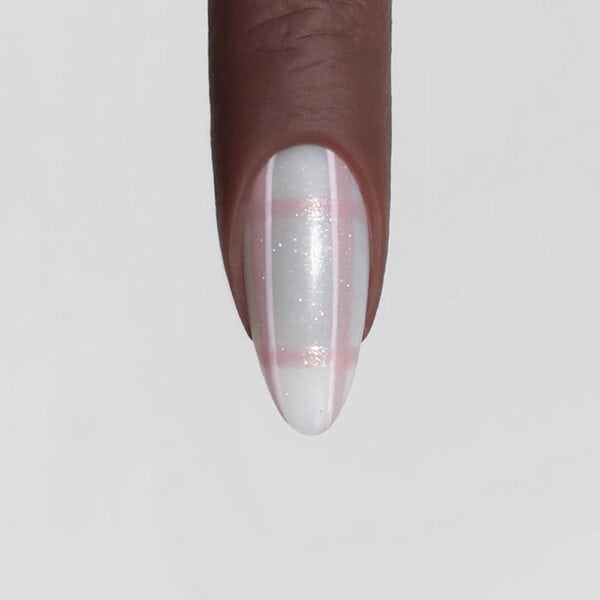 Use a liner brush to paint two vertical lines towards the sides of the nails, using Lecenté Mica Gel Polish in Cannes. Cure.