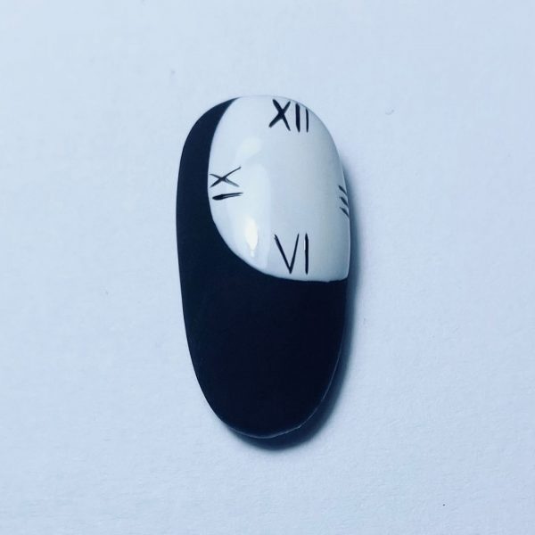 Paint a black dot in the middle of the clock and a thin line around the clock using the Black Poison Arte Brillante Gel Brush. Cure for 60 seconds.