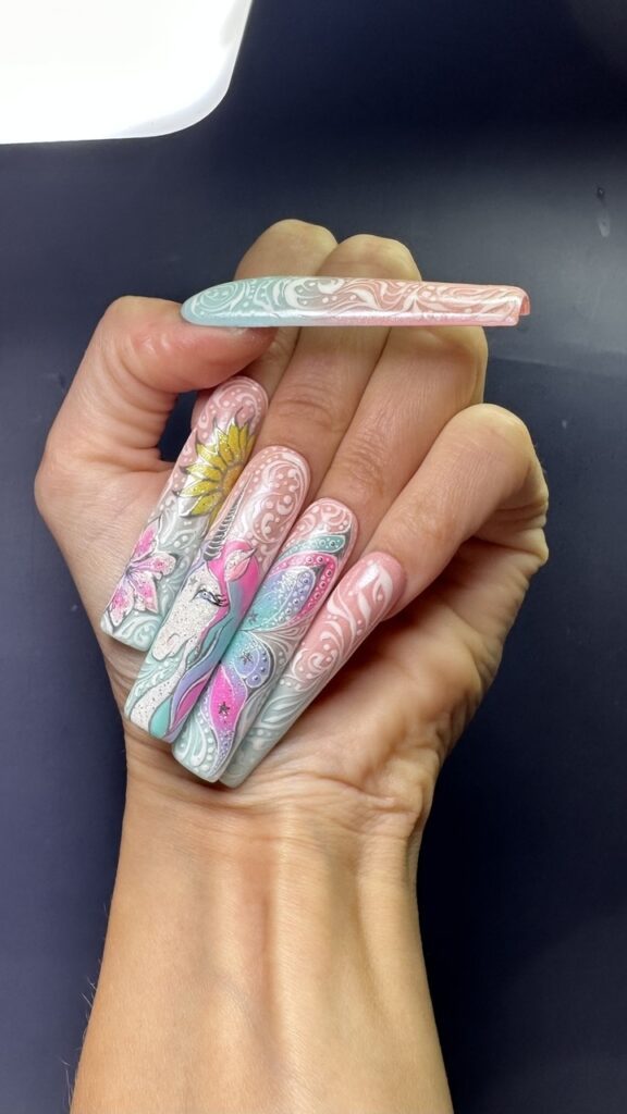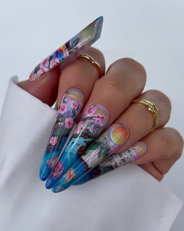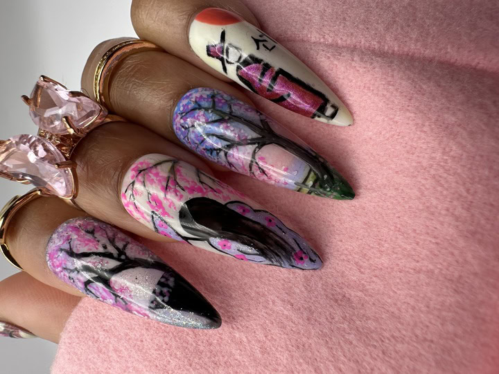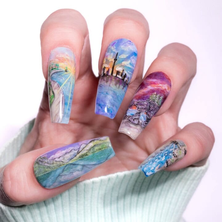 Using Gelish‘s spring 2025 nail colour collection, Now & Zen, as inspiration, create a 2D (flat) nail art design based on the collection theme. ONLY gel polishes, gel paints and acrylic paints were to be used within this challenge (alongside nail art tools such as brushes, sponges or dotting tools).