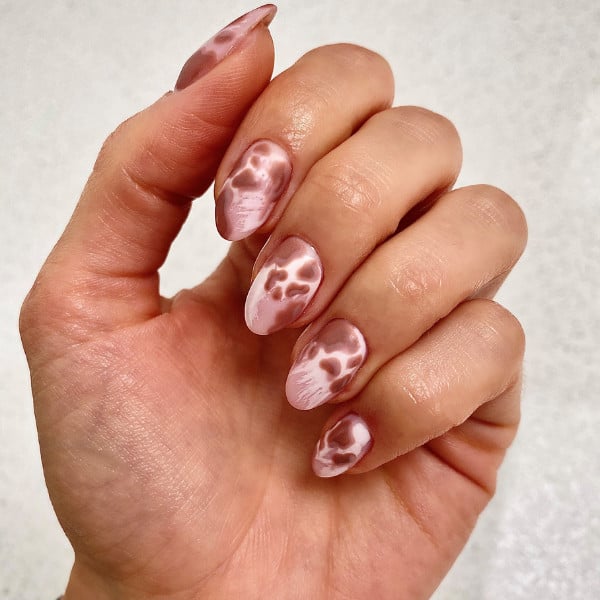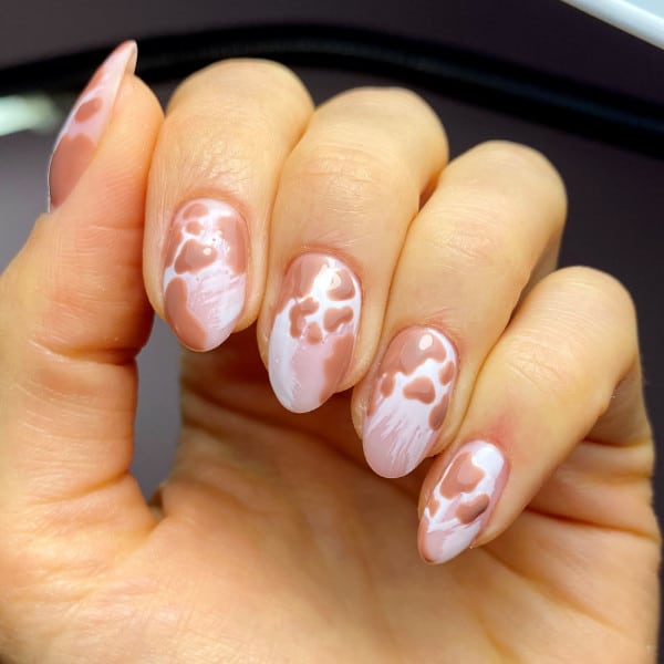 Next, dip a large dotting tool into GELLUX Choco-Latte and create the cow print on random areas of the nails, then cure for 30 seconds.